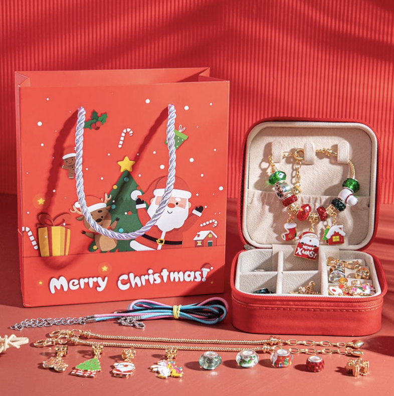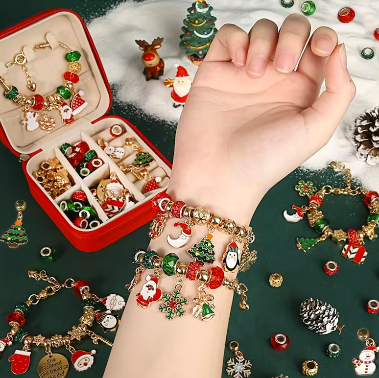 Він містить усе необхідне для виготовлення яскравих браслетів у різдвяному стилі — з кумедними підвісками, бусинами, ланцюжками та фурнітурою.